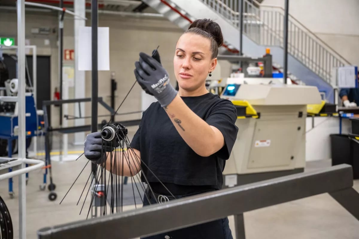 In der Laufrad-Abteilung werden Nabe und Felge mit den Speichen verbunden. Dies geschieht mithilfe von speziellen Laufrad-Automaten und Einspeichmaschinen, die die Speichen in die Felgenbohrungen führen und verschrauben. Anschließend wird das Laufrad zentriert und mit Schläuchen und Reifen ausgestattet.